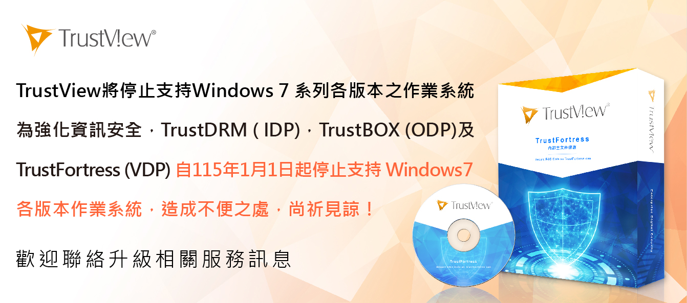 為強化資訊安全,TrustDRM ( IDP),TrustBOX (ODP)及TrustFortress (VDP) 自115年1月1日起停止支持Windows 7 各版本作業系統,造成不便之處,尚祈見諒!